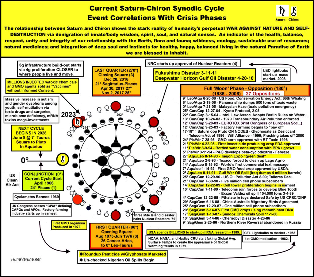 This ego-based sickness is at an all-time high in my lifetime of 67 years as the current Saturn-Chiron synodic cycle wanes, in anticipation of renewal in 2028 — their next conjunction. Saturn-Chiron’s cycle spans about 62 years from conjunction to conjunction. The current cycle began on April 12, 1966 at 24° Pisces, and will renew on June 8, 2028 at 7° Taurus.