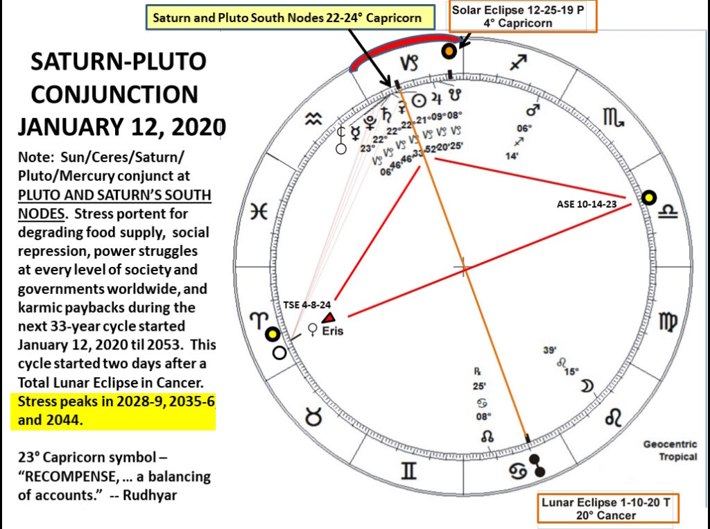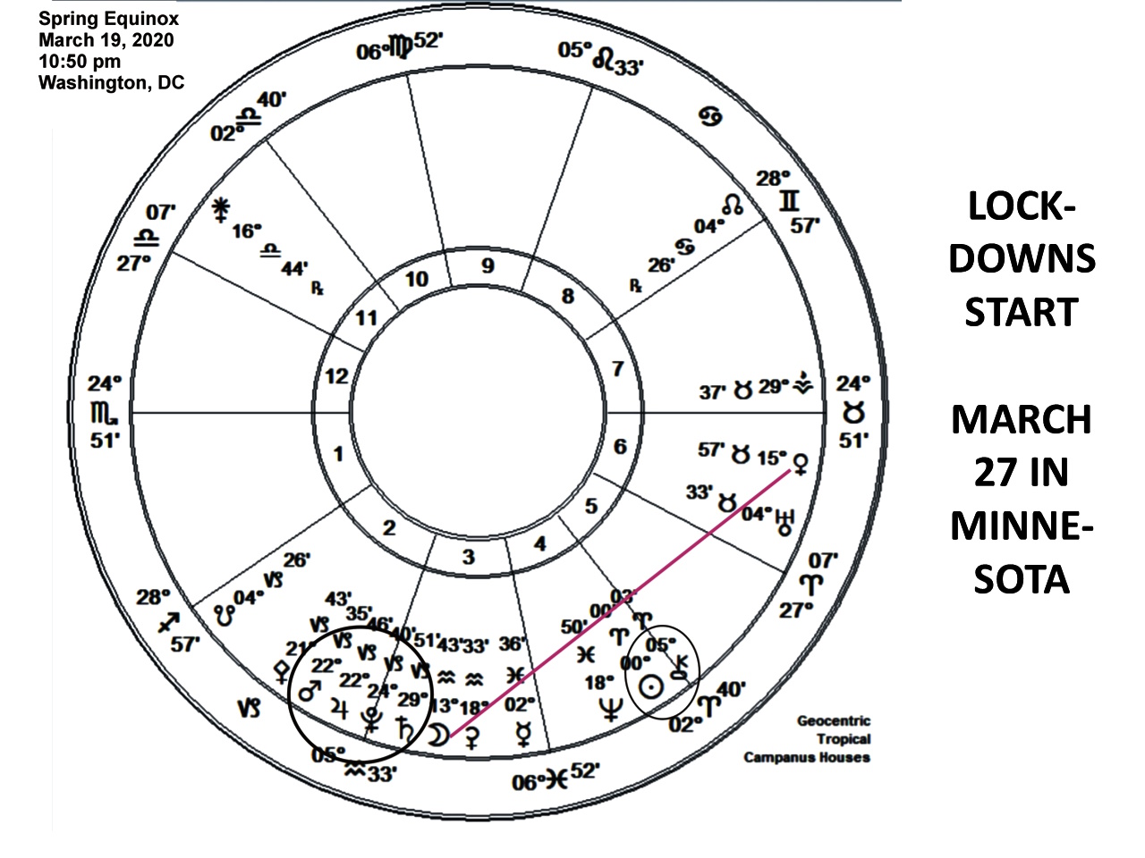 Mars conjoined the Saturn-Pluto conjunction point at 22° Capricorn exactly on the following spring equinox. COVID lockdowns started up promptly in Europe at the equinox, and in Minnesota on March 27.