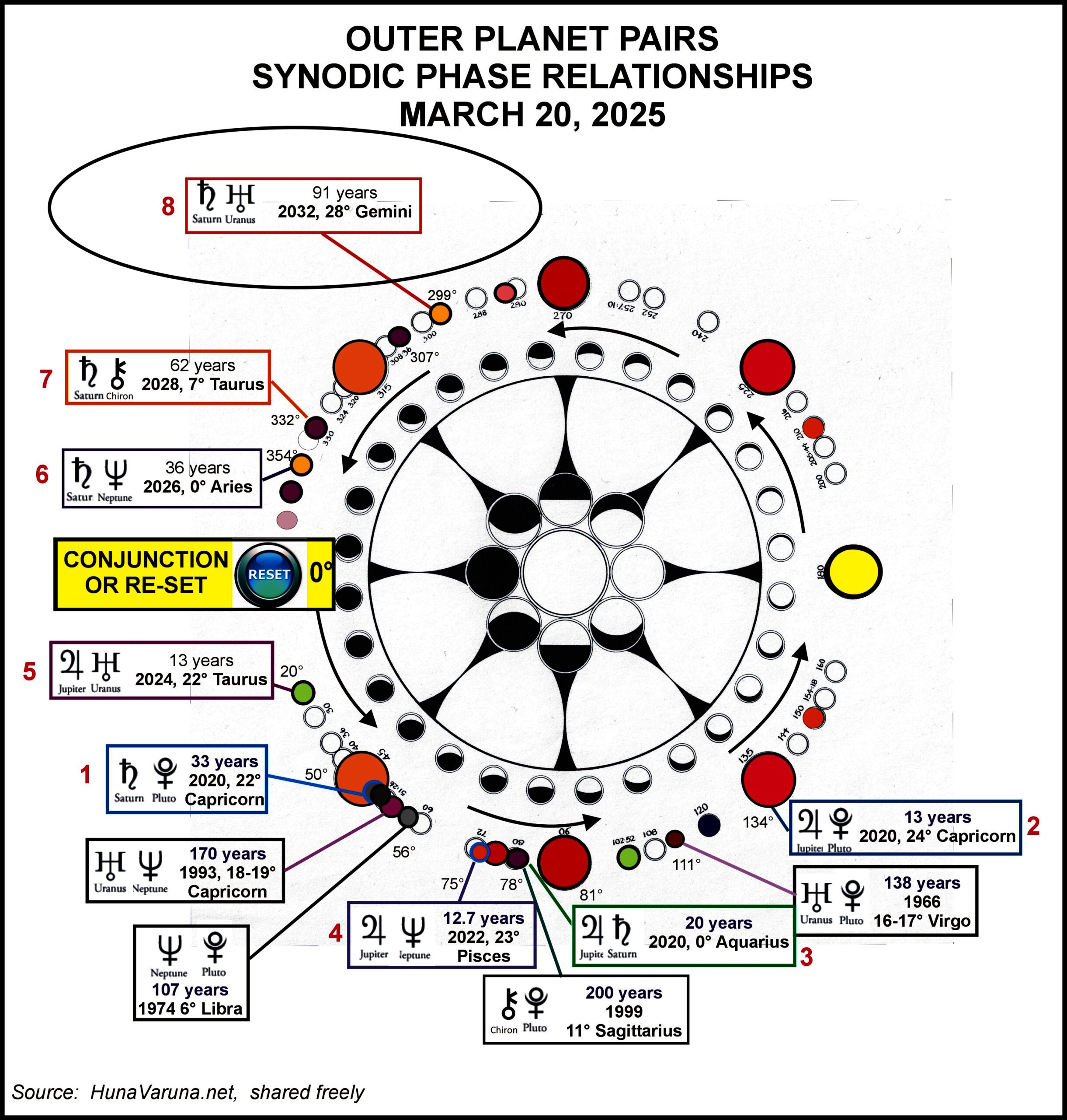 By now, five of the eight outer planetary conjunctions have occurred and we have three left by 2032. (I will update this graphic when I can.)